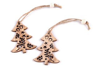 Dřevěné vánoční dekorace mají v sobě ozdobné výřezy.