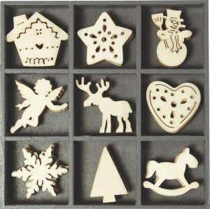 Dřevěné ozdoby v praktickém boxu, 9 motivů po 5 ks od každého motivu, celkem tedy 45 kusů dekorací.