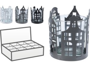 Kovový svícen na čajovou svíčku o rozměru 60×80 mm s motivem domků.