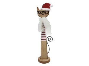 Malá dřevěná dekorace kočky – barevné akcenty pro zimní či vánoční aranžmá.