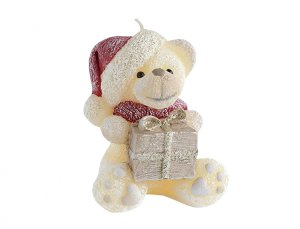 Figurální svíčka ztvárňující medvídka s dárkem, je milý bytový doplněk dolaďující vánoční atmosféru.