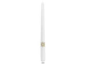 Svíčka ve tvaru válce. Má hladký, lesklý povrch zdobený jemnými třpytivými proužky.