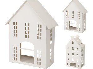 Plechový svícen na čajovou svíčku ve tvaru domku o rozměru 200×110×320 mm.