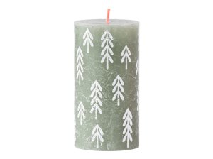Svíčka ve tvaru válce má matný povrch a je zdobena třpytivými vločkami.