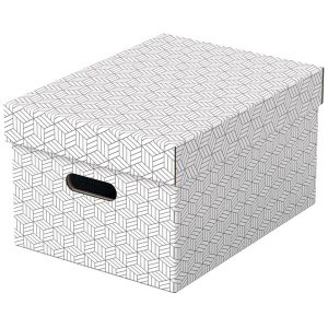 Sada tří středních lepenkových úložných boxů s moderním a stylovým geometrickým designem Ideální pro ukládání dokumentů, hraček, knih a dalších drobností Lze použít samostatně nebo uložit na polici Díky …