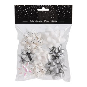 Mašle mix BÍ, STŘ (3 + 5 ks). sada obsahuje 8 mašlí: 3 x větší 5 x menší materiál: polypropylen mix barev: bílá, střírná Ozdobné mašle k doladění balení dárků.
