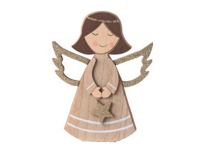 Anděl na postavení je vyroben z přírodního dřeva s glitrem a je vysoký 38 cm.