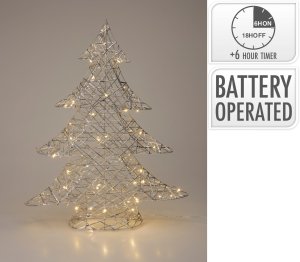 Dekorace STROM 90 cm, LED, STŘ, s časovačem. rozměry: 50 x 13 x 60 cm materiál: kov 60 LED - teplá bílá 3 x AA baterie, nejsou součástí Stříbrný osvětlený stojící stromek navodí tu správnou vánoční …
