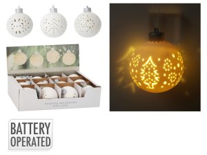 Dekorace KOULE 10 cm, LED, BÍ, závěs, mix. průměr: 9 cm výška: 10 cm materiál: dolomit barva: bílá mix 4 druhy 3 x LR44 baterie, jsou součástí Závěsná dekorační koule, s vyřezanými motivy, v odstínu …