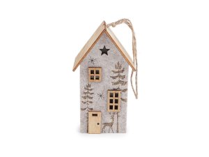 Svítící dekorační domeček má základ z pevného filcu a střechu a detaily ze dřeva.