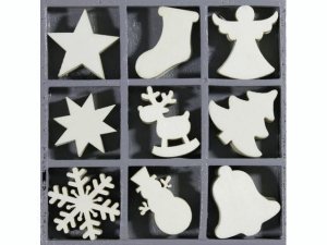 Dřevěné ozdoby v praktickém boxu, 9 motivů po 5 ks od každého motivu, celkem tedy 45 kusů dekorací.