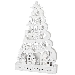 Dekorace KRUH pr. 20 cm, 10LED, závěsný, mix motivů. průměr: 20 cm materiál: topolové dřevo, kov 10 LED - teplá bílá mix 2 druhy: stromy / jelen, stromy / domky 2 x AA baterie, nejsou součástí Záavěsná …