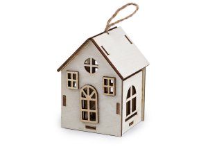 Dřevěný svítící domeček má poutavě zpracované výřezy.