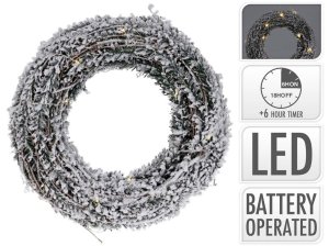 Bílý LED věnec z ratanu s glitrem – svítící vánoční dekorace na zavěšení.