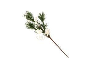Větvička zasněženého jehličnanu s bílými bobulemi a šiškou.