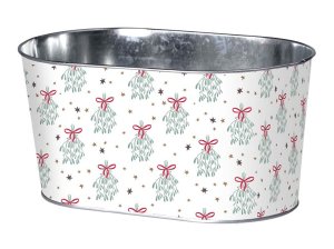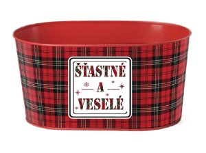 Oválný plechový květináč „Šťastné a veselé“ – barevný design s vánoční kostičkou, praktický a dekorativní.
