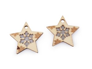 Dřevěné ozdoby vynikají svým zpracováním - jsou slepené ze dvou vrstev, spodní má třpytivé glitry, které pronikají vnitřní vrstvou s výřezem.