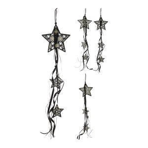 Dekorace HVĚZDA 16 cm, závěsná, dřev. ČER, se stužkami, mix. šířka hvězdy: 16 cm celková výška: 70 cm materiál: dřevo, stuha barva: černá / zlatá mix 3 druhy Závěsná velká dřevěná hvězda a dvě malé hvězdy, …