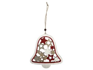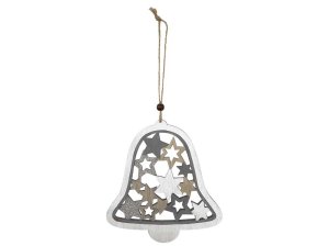 Dřevěná vánoční ozdoba v podobě zvonku, umístěném v kruhu s očkem pro zavěšení.
