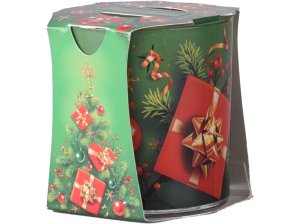 Vonná svíčka ve skle ozdobeném glitrovými proužky a hvězdičkami.