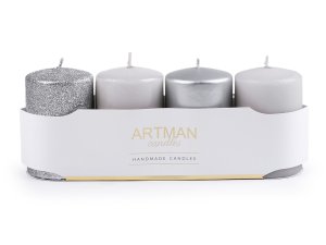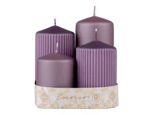 Sada adventních svíček. Mají tvar válce a povrch mají hladký, v úpravě metalický lesk.