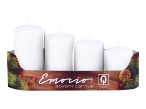 Bílá matná adventní svíčka ve tvaru válce.