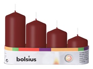 4 adventní svíčky matné bordó barvy ve tvaru válce setříděné dle výšky.