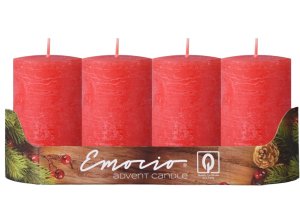 4 adventní svíčky matné červené barvy ve tvaru válce setříděné dle výšky.