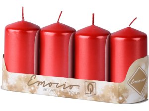 Sada adventních svíček. Mají tvar válce a tvoří kombinaci několika druhů dekorů: matný, metalický, lakovaný a brokátový.