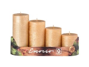 Sada adventních svíček. Mají tvar válce a tvoří kombinaci několika druhů dekorů: matný, metalický, lakovaný a brokátový.