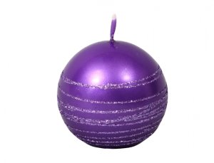 Fialová vánoční svíčka ve tvaru koule zdobená fialovými glitrovými proužky.
