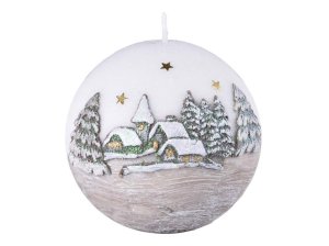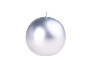 Vánoční svíčka ve tvaru koule je ozdobena stříbrnými reliéfy.