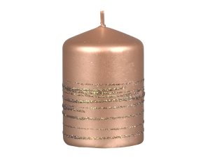 Měděná glitrovaná vánoční svíčka ve tvaru válce vodorovně škrábaná.