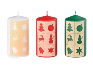 Vánoční svíčka ve tvaru válce, s plochou hlavou, s plastickou aplikací zasněžených chaloupek, působí dekorativně a hodí se zejména pro období Vánoc a zimy.