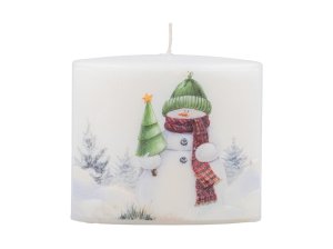 Vánoční svíčka ve tvaru válce, s plochou hlavou, s plastickou aplikací sněhuláka a vloček působí dekorativně a svátečně.