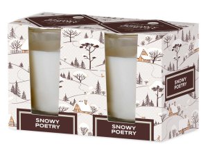 Vánoční vonná svíčka ve skle s dekorací sněhových vloček.