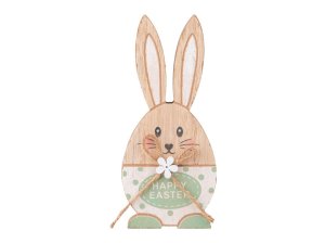 Dekorace v podobě zajíce se zelenou kraslicí.
