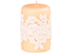 Velikonoční svíčka ve tvaru válce je ozdobena vyřezávaným obrázkem zajíce s vejce a květinami.