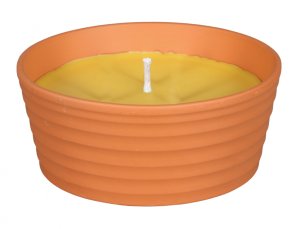 Zahradní repelentní svíčka, vůně citronela, v keramické misce s dřevěnými knoty.