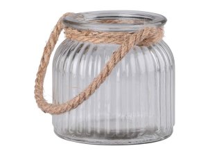 Prostornější skleněná lampa s lanovým závěsem, pro svíčku nebo světelný řetěz.