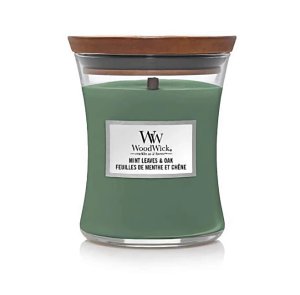 Vonná svíčka Mint Leaves & Oak v sobě ukrývá vůni čerstvých lístků máty, která dodává zářivou svěžest dřevitému akordu zeleného mechu, ohořelého dubu a cypřiše.