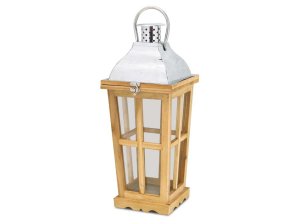 Přírodní dřevěno-kovová lucerna – elegantní dekorace pro svíčku a útulnou atmosféru.