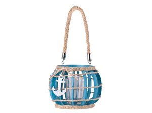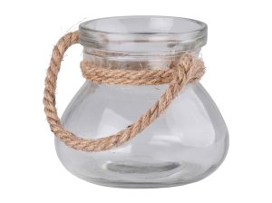 Skleněná lampa s lanem pro zavěšení, vhodná na svíčku, přírodní styl.