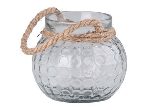 Skleněná závěsná lampa s přírodním lanem, vhodná do interiéru i na ven.
