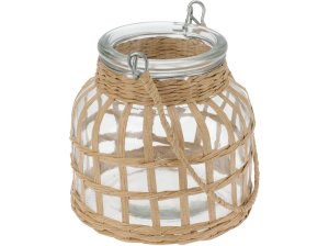 Skleněná lampa s uchem a dekorativním lýkem – elegantní doplněk pro svíčku a přírodní atmosféru.