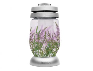 Hřbitovní lampa ozdobená obrázky vřesu, s víčkem a podstavcem ve stříbrné barvě.