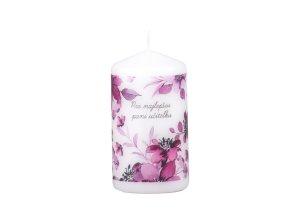 Elegantná sviečka v tvare valca s jemným kvetinovým vzorom a milým venovaním „Pre najlepšiu pani učiteľku“.