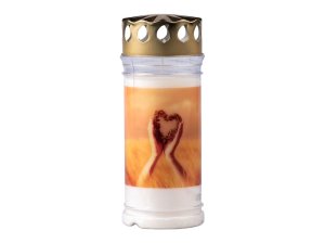 Svíčka s motivem srdce v dlaních pro hřbitovní účely.