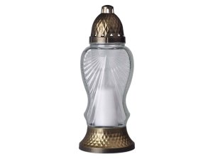 Plastová hřbitovní lampička plněná, se zdobeným kovovým víčkem.