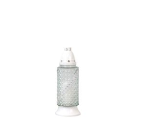 Skleněná hřbitovní lampa ve tvaru úzké lucerny s jemně profilovaným povrchem s motivy kosočtverců a pruhů.